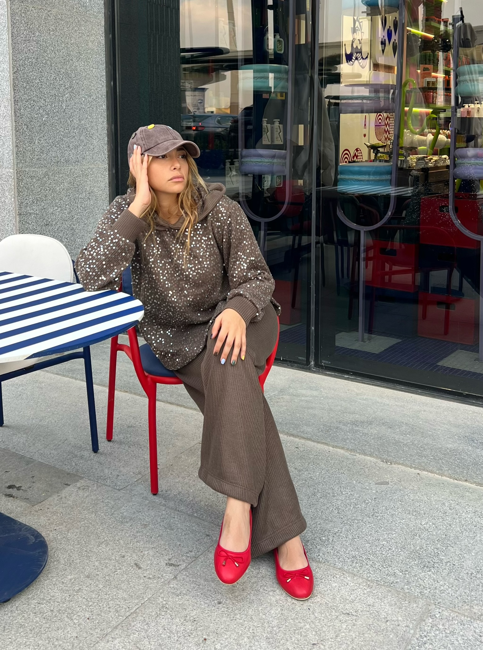 The Nutmeg Hoodie brings effortless glamour to everyday comfort. Crafted in a soft cocoa-brown knit, it’s fully embellished with light-catching sequins that create a subtle, all-over shimmer. The relaxed silhouette, cozy hood, and ribbed cuffs make it an easy, throw-on piece that still feels elevated.